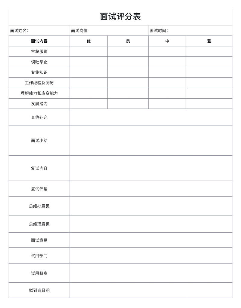 适合HR在招聘过程中使用。通过统一的评分标准记录候选人表现,能有效避免主观偏差,让招聘结果更具公正性与参考价值。