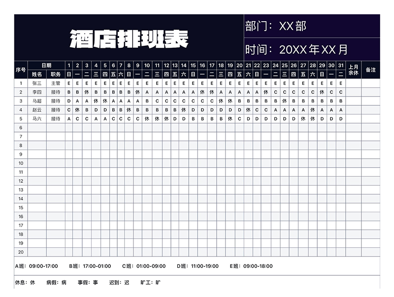 专为服务行业设计。该模版能够直观展示员工班次,可记录一个月的人员排班时间,既能避免人员冲突,又方便主管灵活调整。