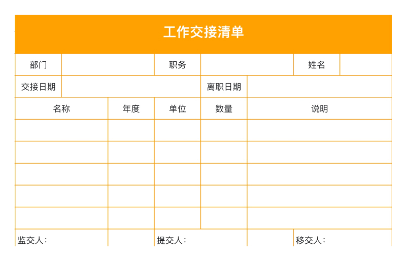 在员工岗位变动或离职时,交接工作是必不可少的环节。使用此模版,可以系统记录部门、职务、资料与责任人,确保交接过程清晰透明,减少遗漏。