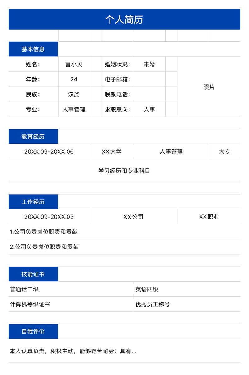 适用于求职工作场景。该模板包括个人信息、求职意向、工作经历、技能证书等内容,通过 Excel 简历模板你可以按时间顺序展示职涯发展,让招聘方快速抓住重点。
