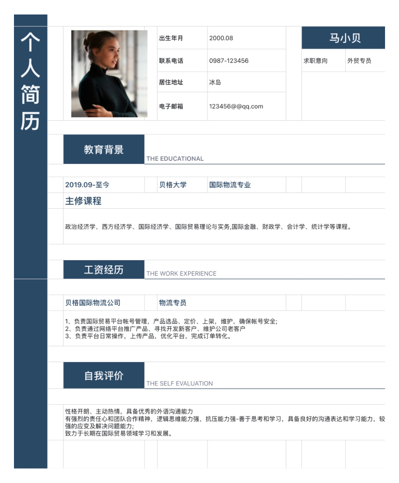 针对物流行业求职者设计。内容涉及教育背景、工作经历、自我评价等。通过这款简历模板,物流岗位申请者能更具体地呈现专业技能与岗位匹配度。