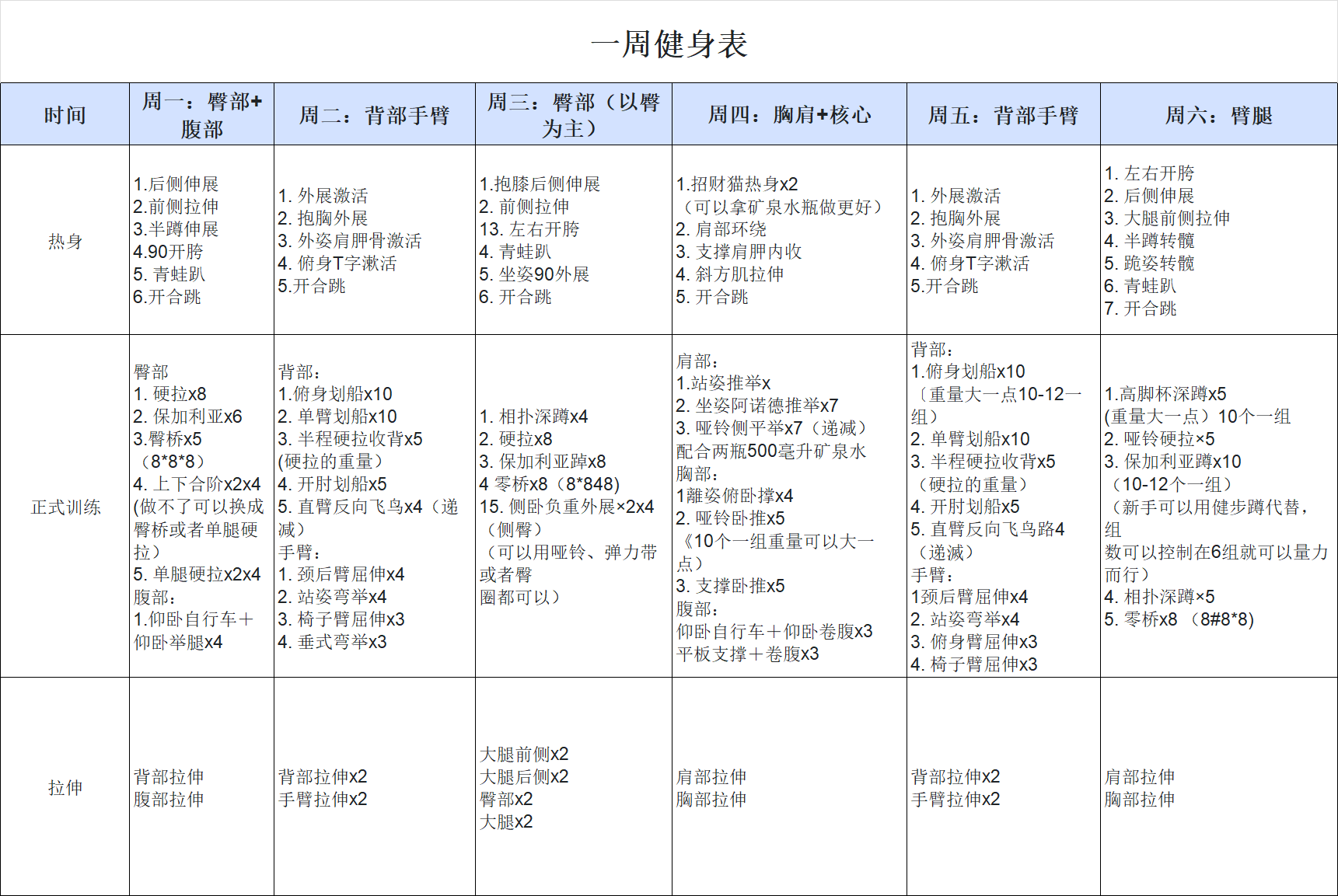 按周划分臀腿、背部手臂等不同部位训练,包含热身、正式训练、拉伸环节,针对性塑造身材。