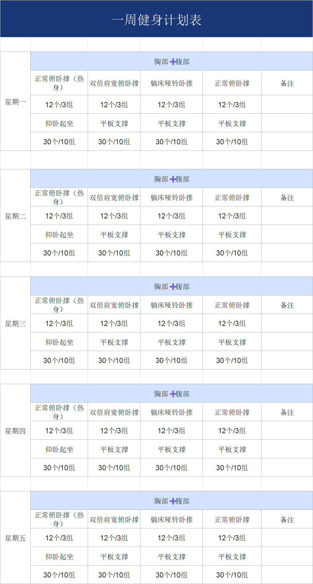 聚焦胸部与腹部训练,细化每个动作的组数与次数,精准雕琢核心与胸肌线条。