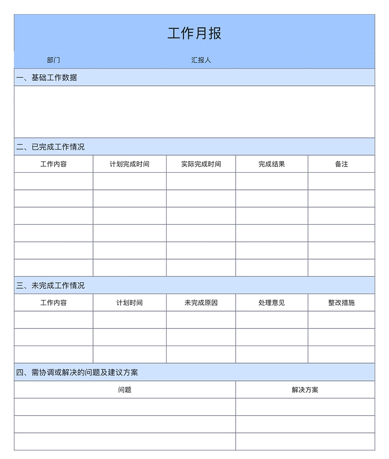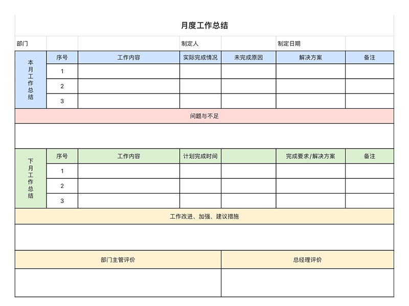 此模板包括本月工作内容、下月工作总结和工作改进等内容,帮助你系统梳理一个月的成长轨迹,也非常适合用于绩效评估与述职报告。