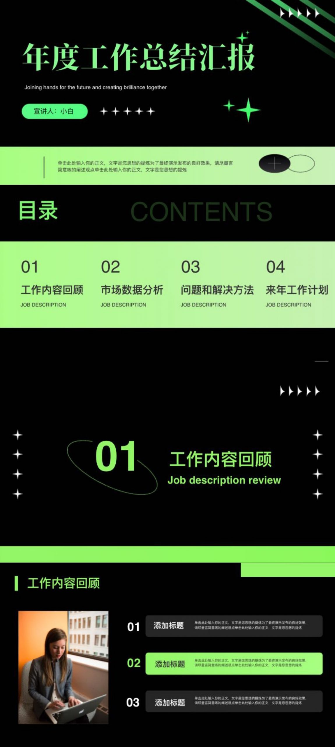 采用绿色简约设计,聚焦年度工作,涵盖内容回顾、数据分析、问题解决与计划制定。