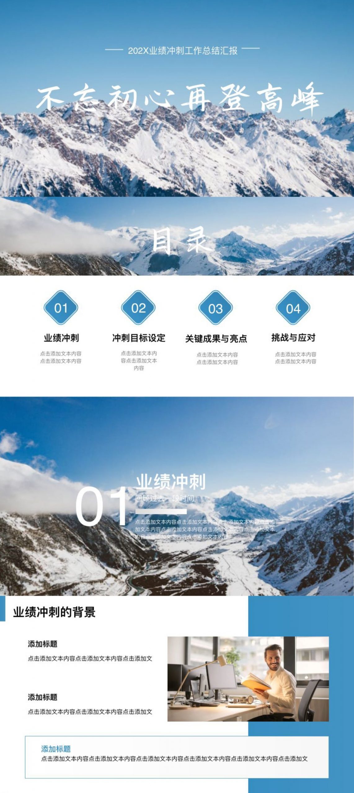 借雪山背景营造攀登高峰的视觉感,专为业绩冲刺阶段的工作复盘与成果展示而设。