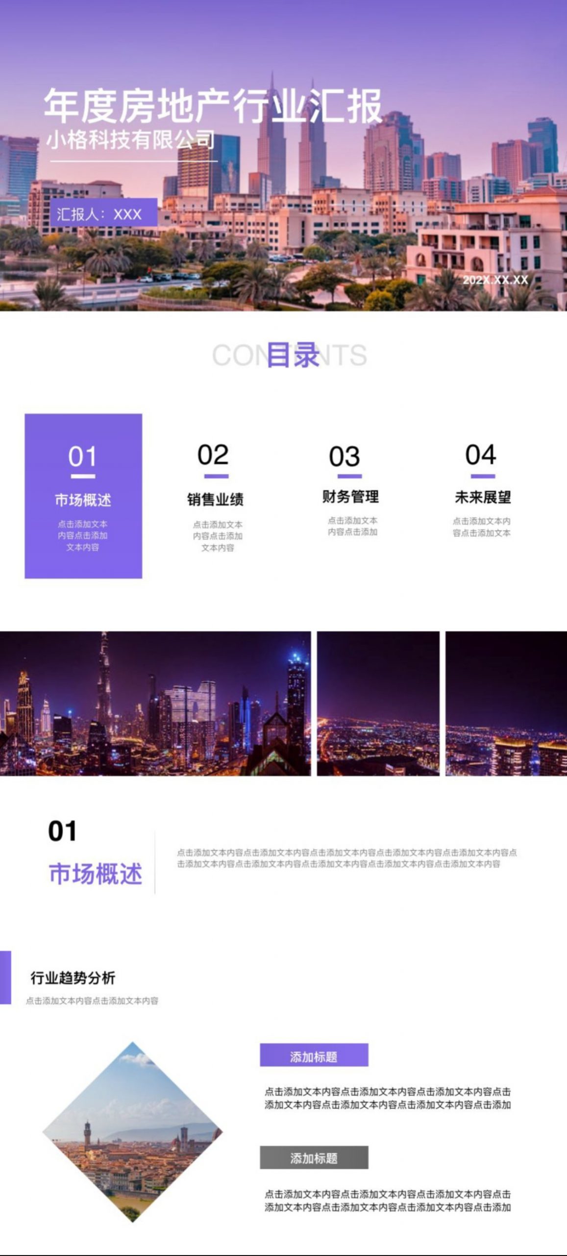 以紫色城市景观为基调,围绕房地产行业,从市场、销售、财务等维度开展年度总结与展望。