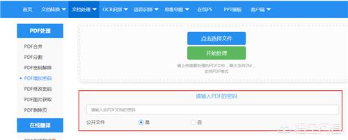 接着,进入加密界面,点击“点击选择文件”,导入PDF文件,然后输入PDF密码,点击“开始处理”,就可以进行文档加密了。