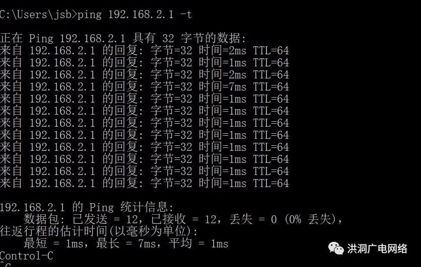 - 然后ping一下网关,例如这里应该是输入ping 192.168.2.1 -t再回车。-t的意思就是一直ping下去。大概几分钟后,按住键盘的Ctrl+c,终止。