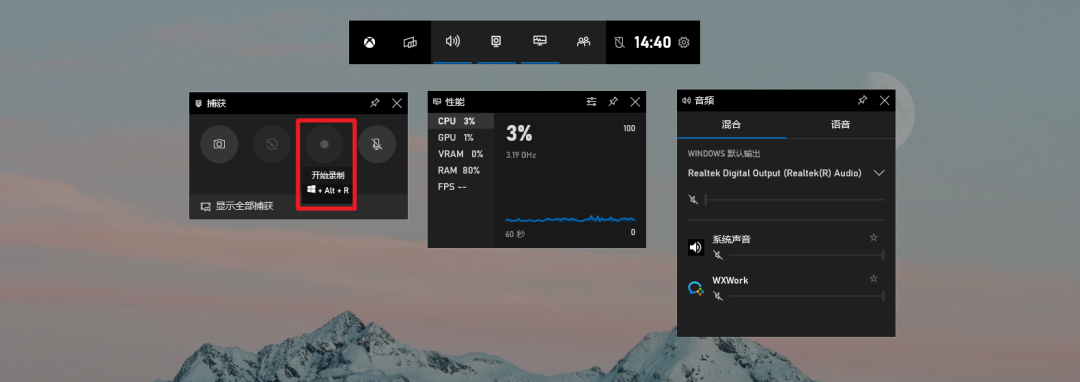 它除了录屏功能之外,还有电脑性能、音频设置、Xbox 社交等功能。
