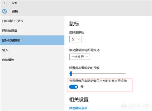 步骤:设置—设备—鼠标和触摸板—打开“当我悬停在非活动窗口上方时对其进行滚动”。