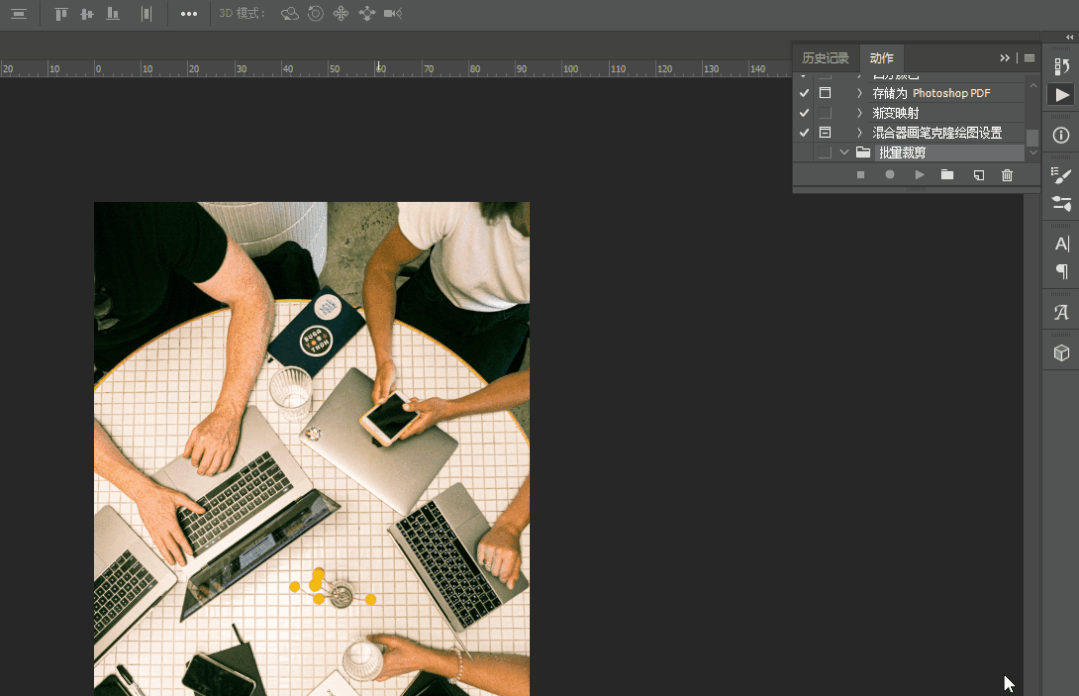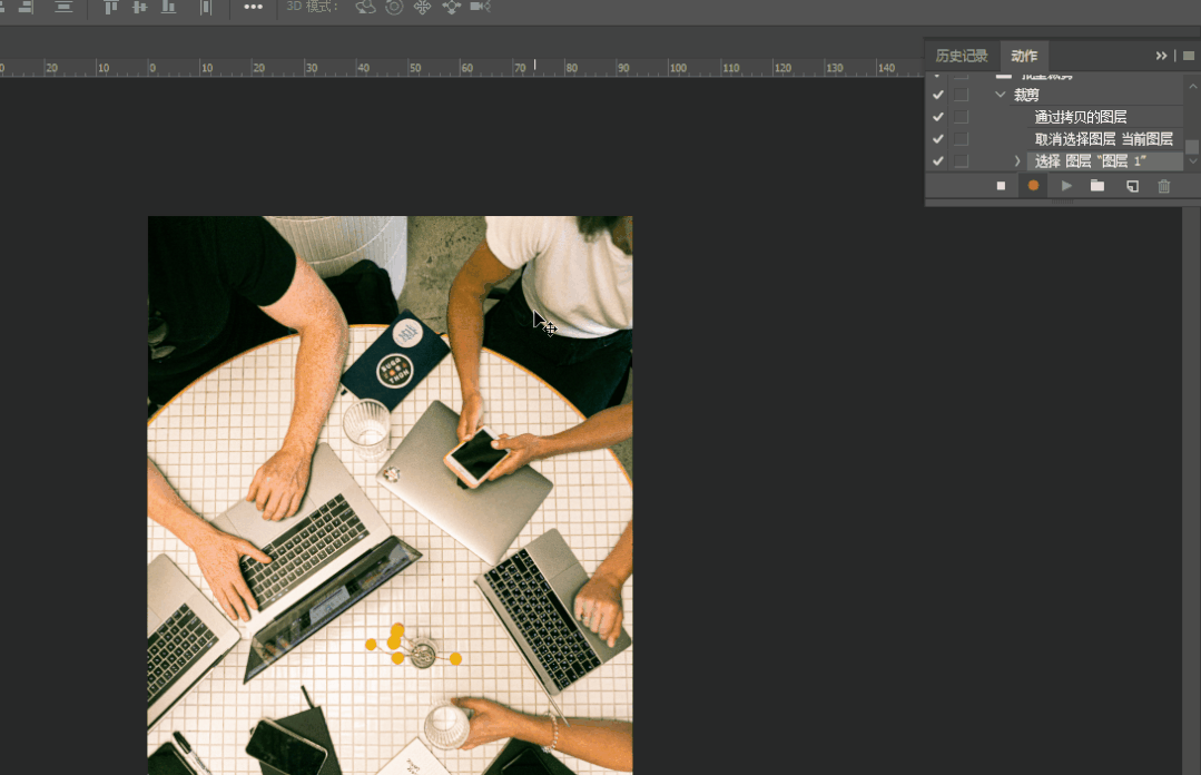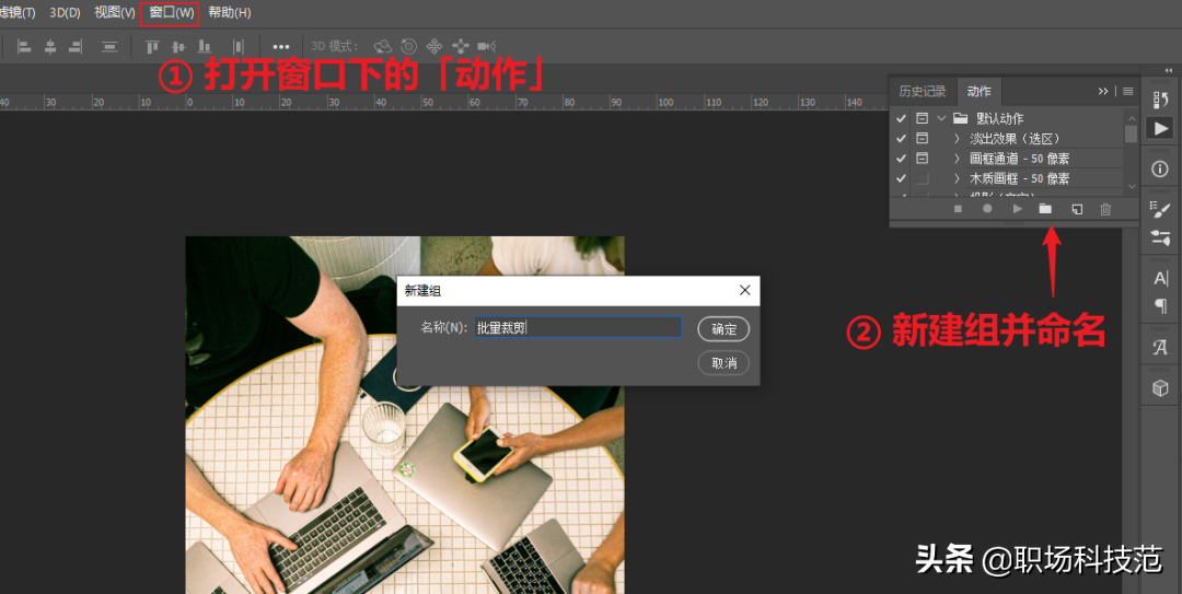 1.首先我们用PS打开图片,点击顶部的【窗口】-【动作】,然后【新建组】并命名,这里我们命名为“批量裁剪”。