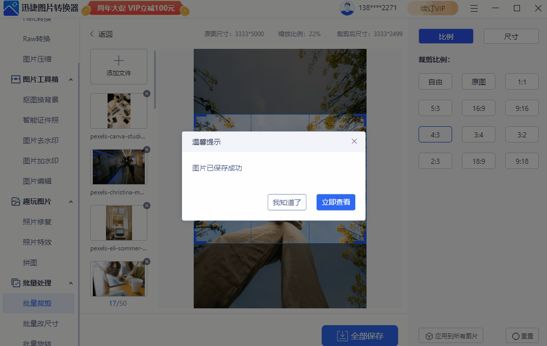 2.单次上传50张图片,选择比例后点击「应用到所有图片」,就能完成批量裁剪。