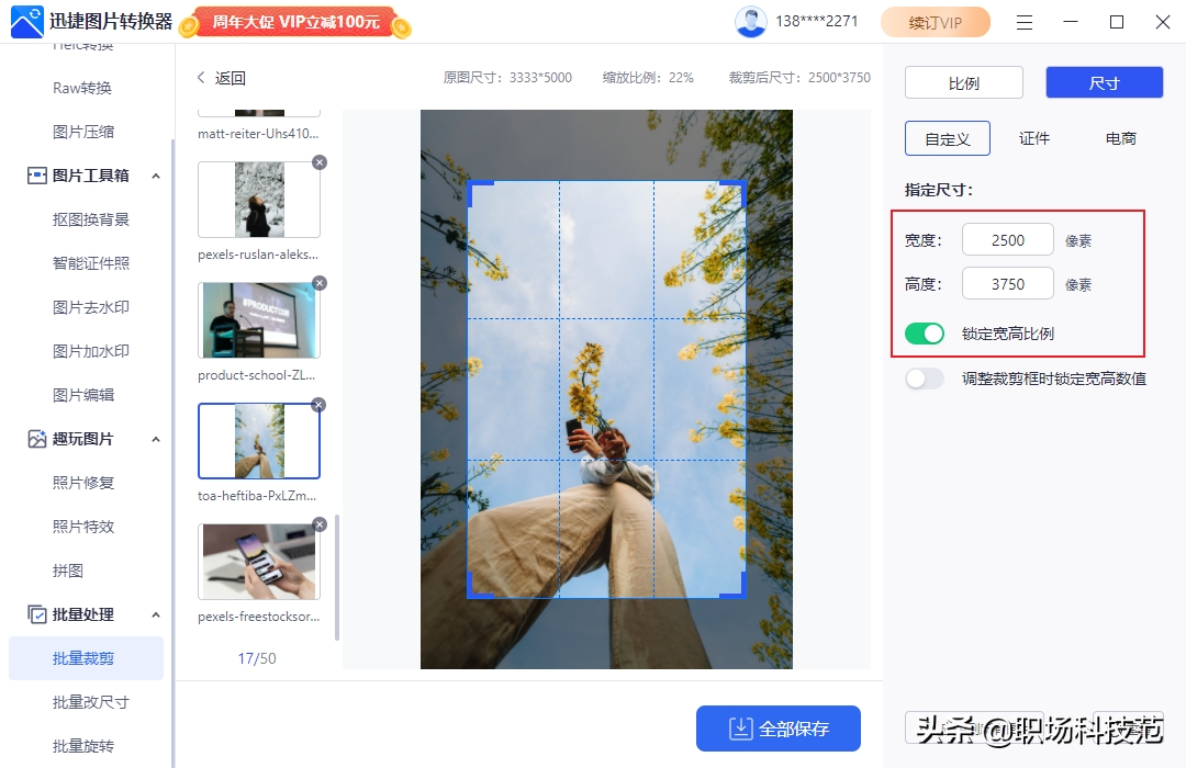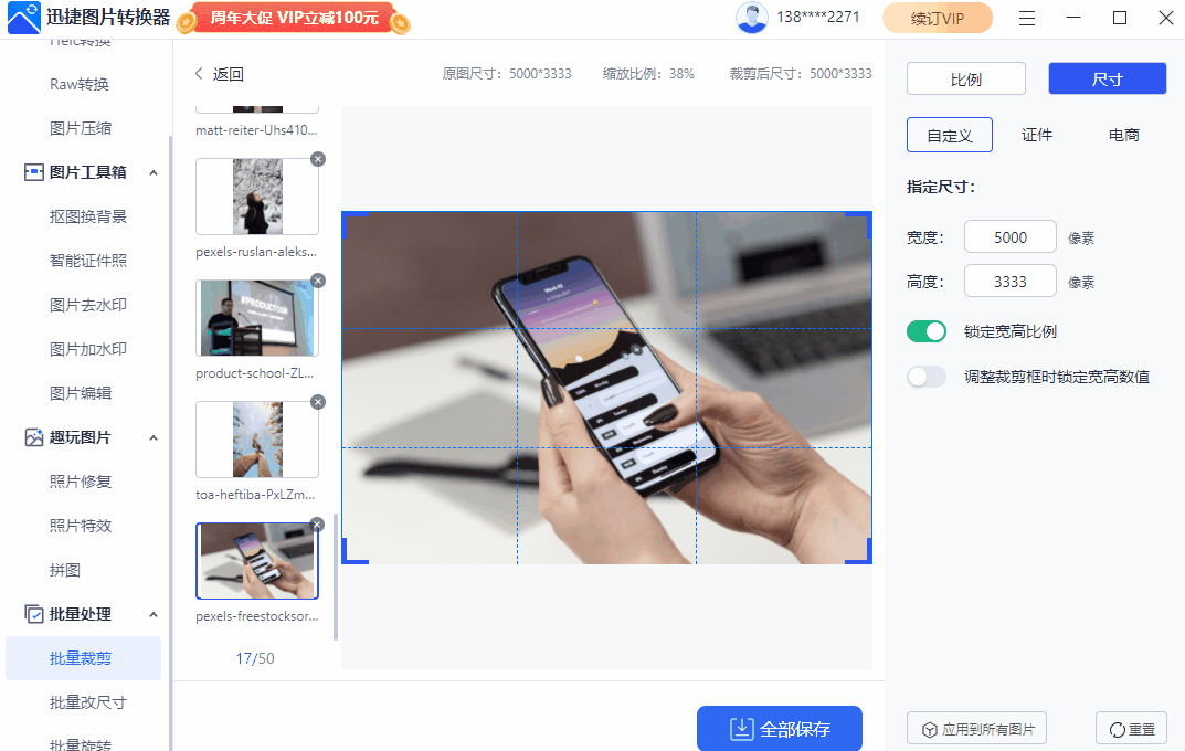 4.如果是处理电商产品图和证件照就更方便了,直接套用软件内置的尺寸,无需手动调整,300张图也能10秒搞定。
