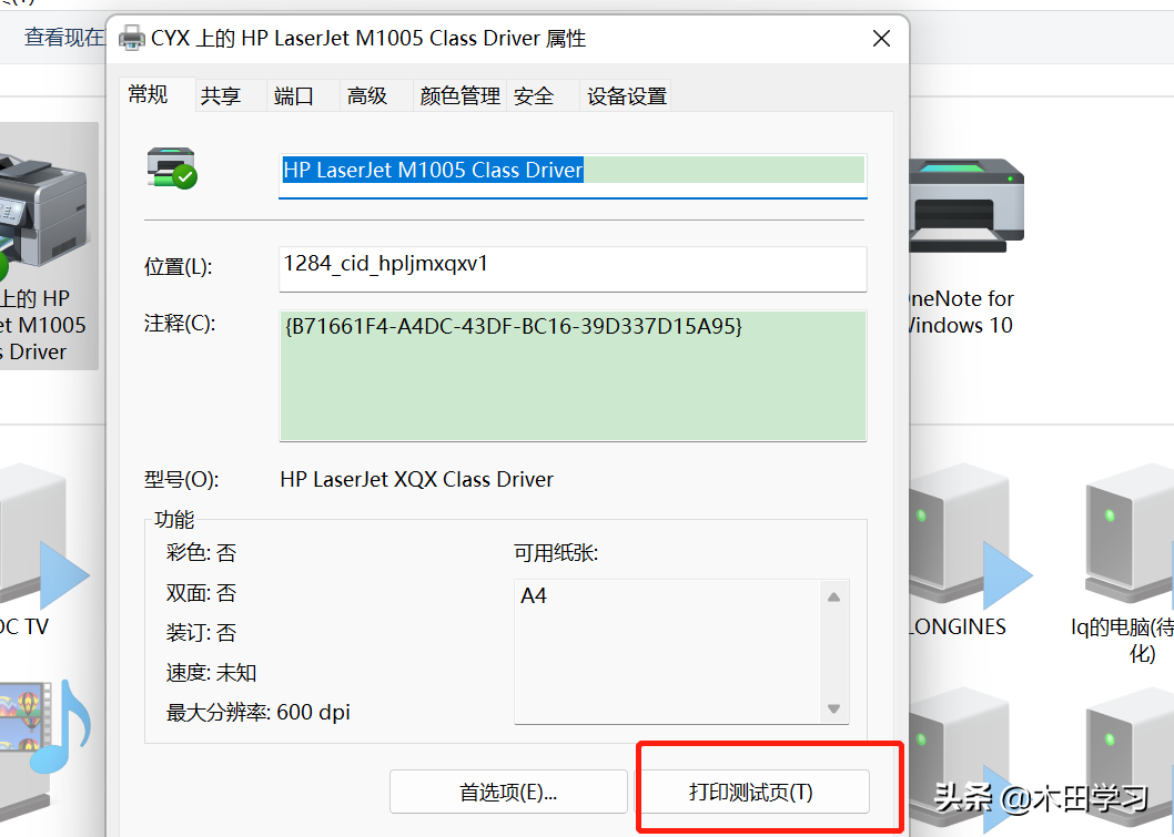 (3)控制面板——设备与打印机,在打开的界面选择刚刚连接的共享打印机,鼠标右键设置为默认打印机,然后选择打印机属性——打印测试页测试是否成功即可