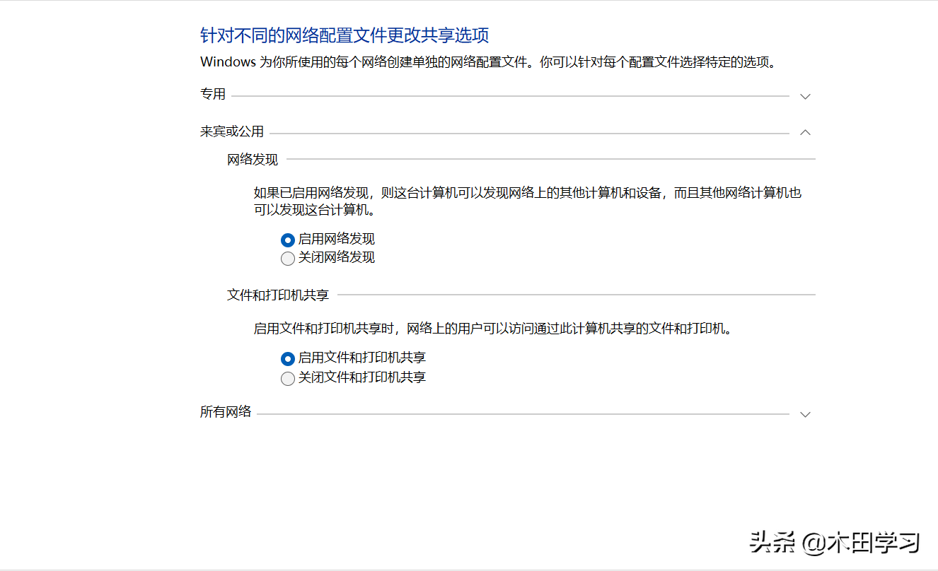a、主机共享设置:打开控制面板——网络和共享中心——更改高级共享设置,专用设置启用文件和打印共享,并启用网络发现;来宾或公用设置启用文件和打印机共享并启用网络发现,所有网络设置为无密码保护的共享,点击保存更改