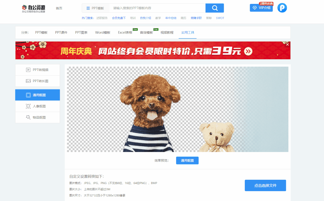 其实「办公资源」不仅是一个全能的Office模板库,也不仅是一个拥有高质量视频教程的网站,它还有「实用工具」,里面就包含PPT转视频、PPT转长图和抠图工具。其中抠图分为通用抠图、人像抠图和物品抠图,非常细致。