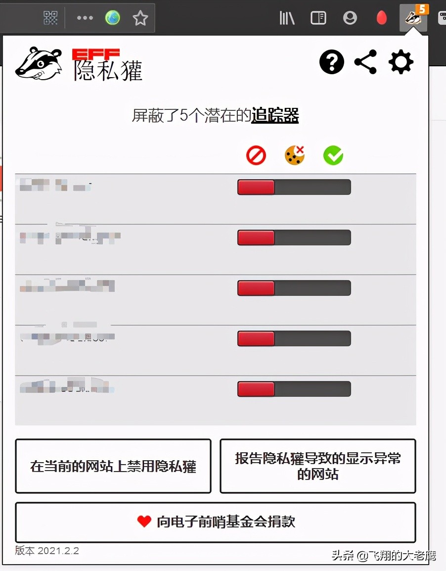 隐私獾(Privacy Badger)是由电子前哨基金会(EFF)开发的一款浏览器附加插件,保护您在浏览网页时免受跟踪。大部分网站都植入第三方跟踪器,在未经允许情况下跟踪您访问过哪些页面,又停留多久。如果您安装隐私獾,许多跟踪器将被阻止,对于分析公司而言就似乎您从未到来一样。尽管网站运营者能够获知您的到来,但却难以建立您的虚拟用户画像并将这些数据分享给第三方。