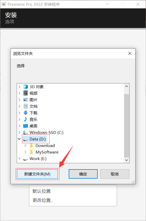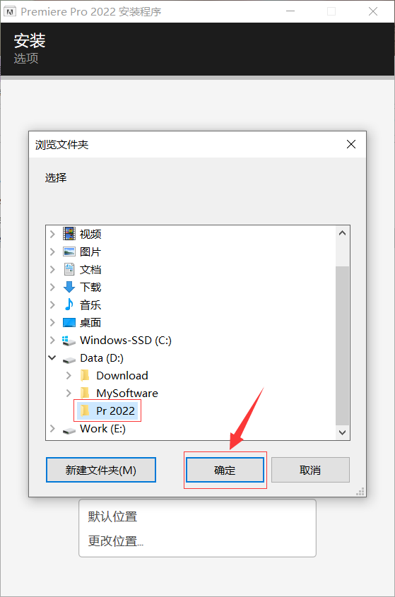 7.将文件夹名称修改为【Pr 2022】,然后点击确定