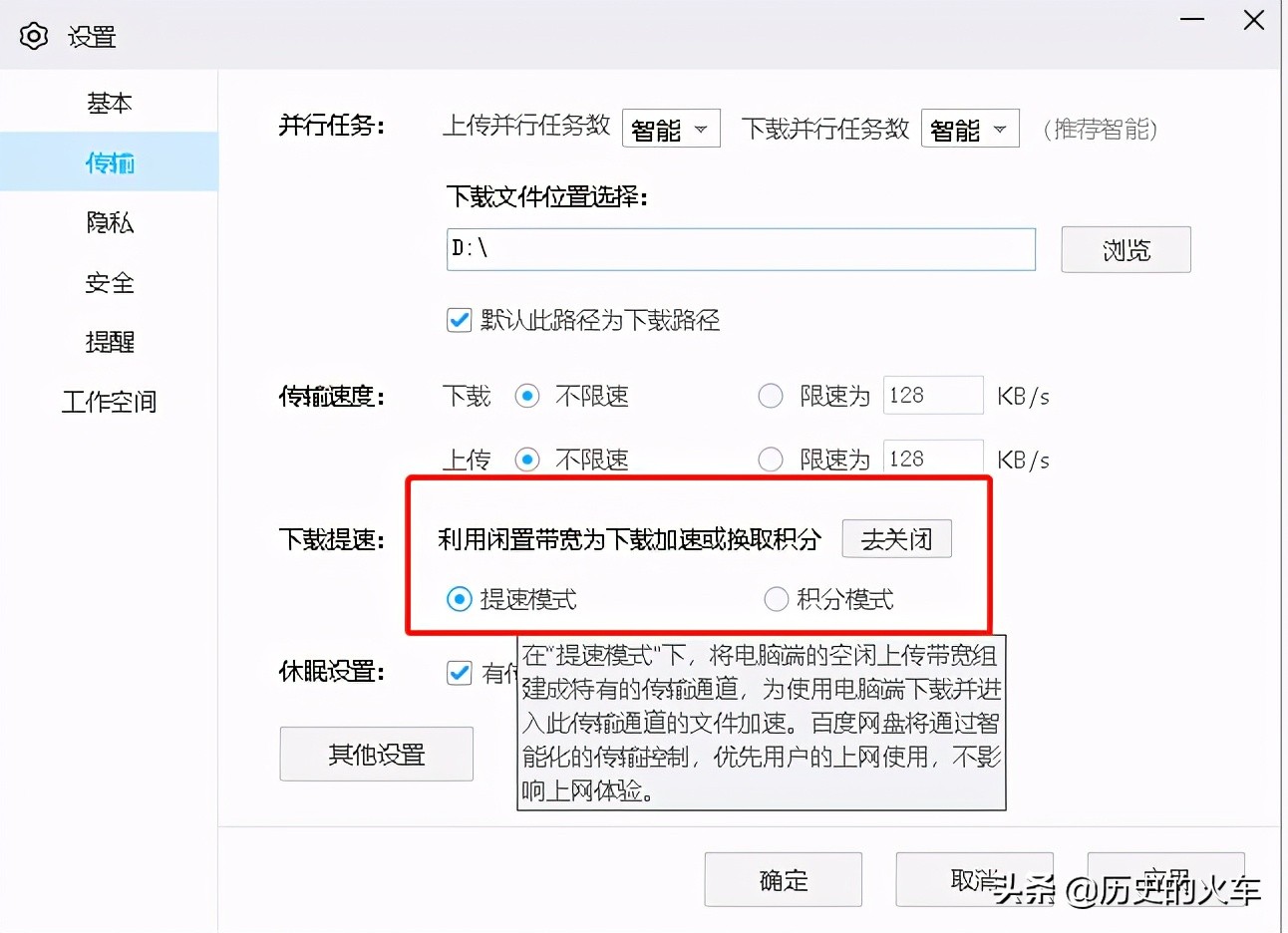 仅限在PC端,打开设置-传输里,打开下载提速,选择提速模式。根据说明,该功能仅对PC端有效,据说对热门文件的效果好些。个人试用未觉察到效果,可能下载的是自己的资料的原因吧。对于经常下载热门资源如电影、视频等的朋友可能有一定的作用。打开后会在闲时利用你的宽带上传,介意的就算了。