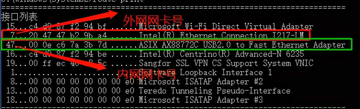 分别找到外网网卡和内网网卡,记录下是前面的数字,这个数字是网卡编号。