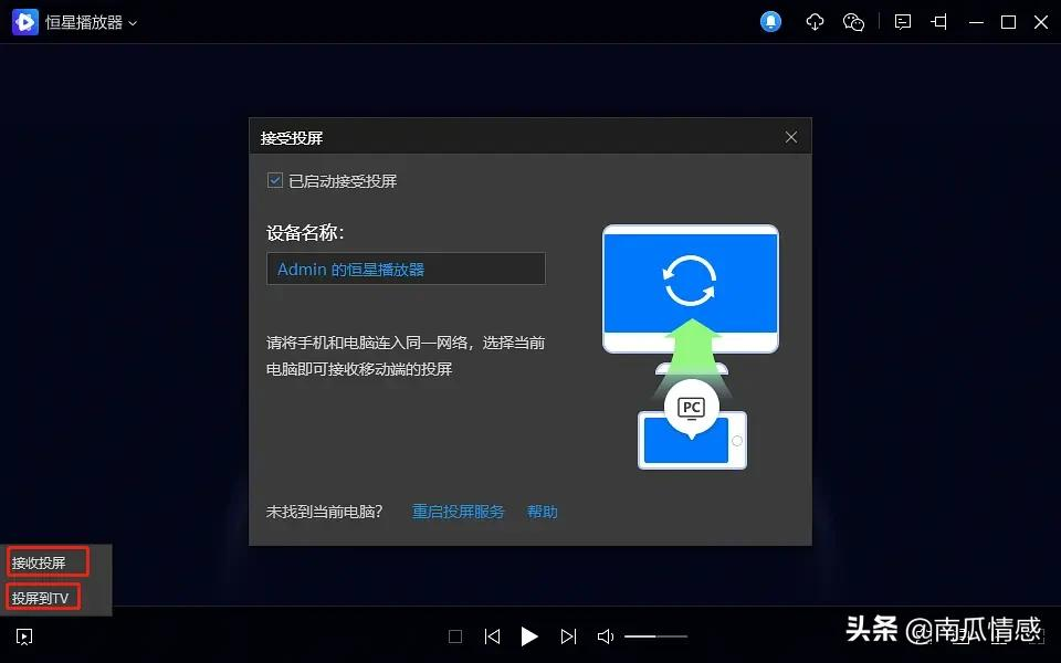 恒星播放器还支持DLAN投屏,手机端视频可以投到电脑端用恒星播放器观看,大屏观看,难道不比手机端看着爽吗?我们也可以将恒星播放器播放的视频投到电脑端。选择界面左下方接收投屏或者投屏到TV,匹配到相应设备连接即可。