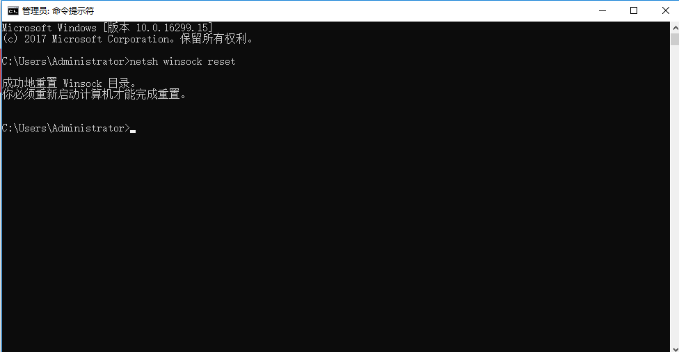 第二步就是在打开的命令提示符里输入命令“netsh winsock reset”,输入完之后按回车键,就完成命令,可以关闭页面了。