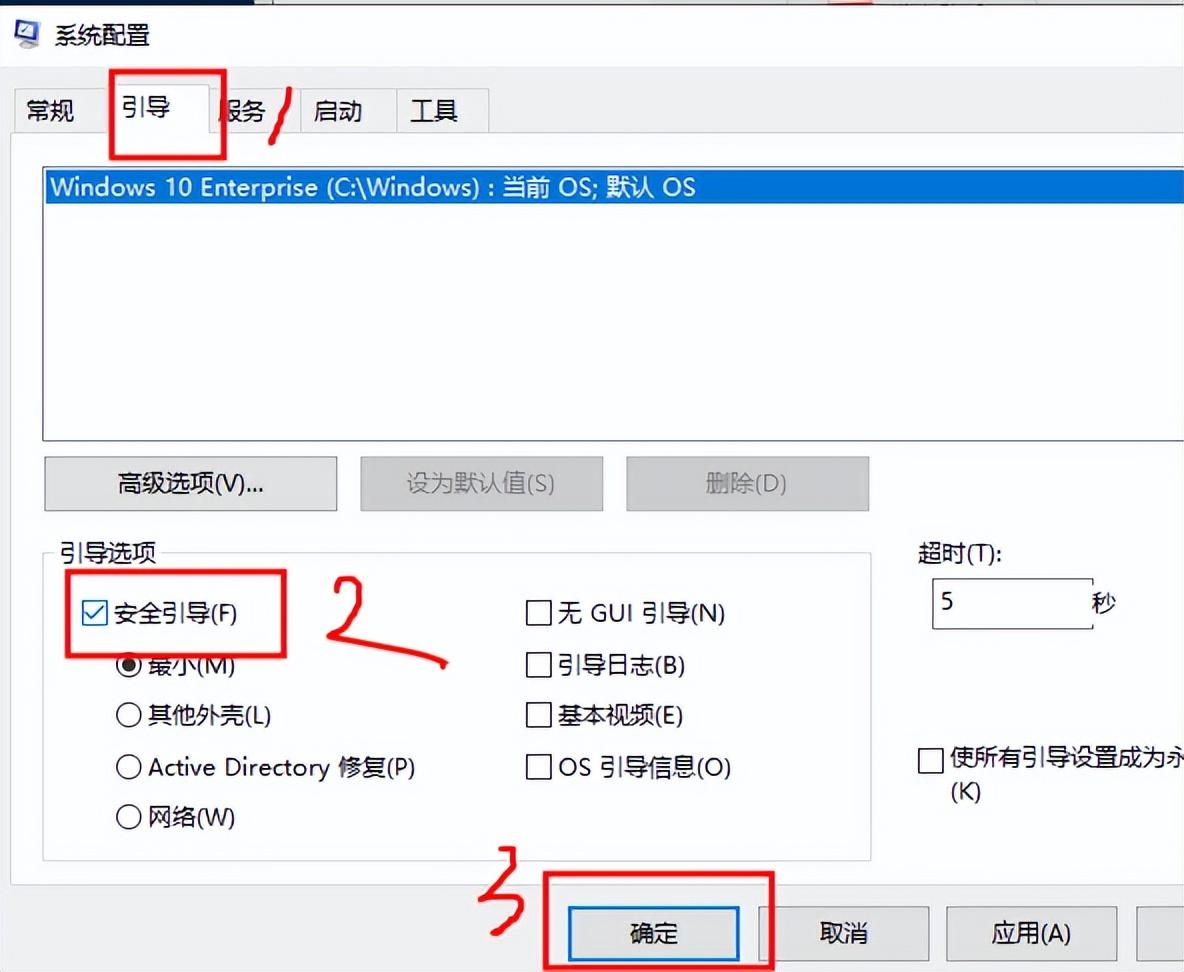 win R→msconfig→切换到引导选项卡,选中“安全引导”