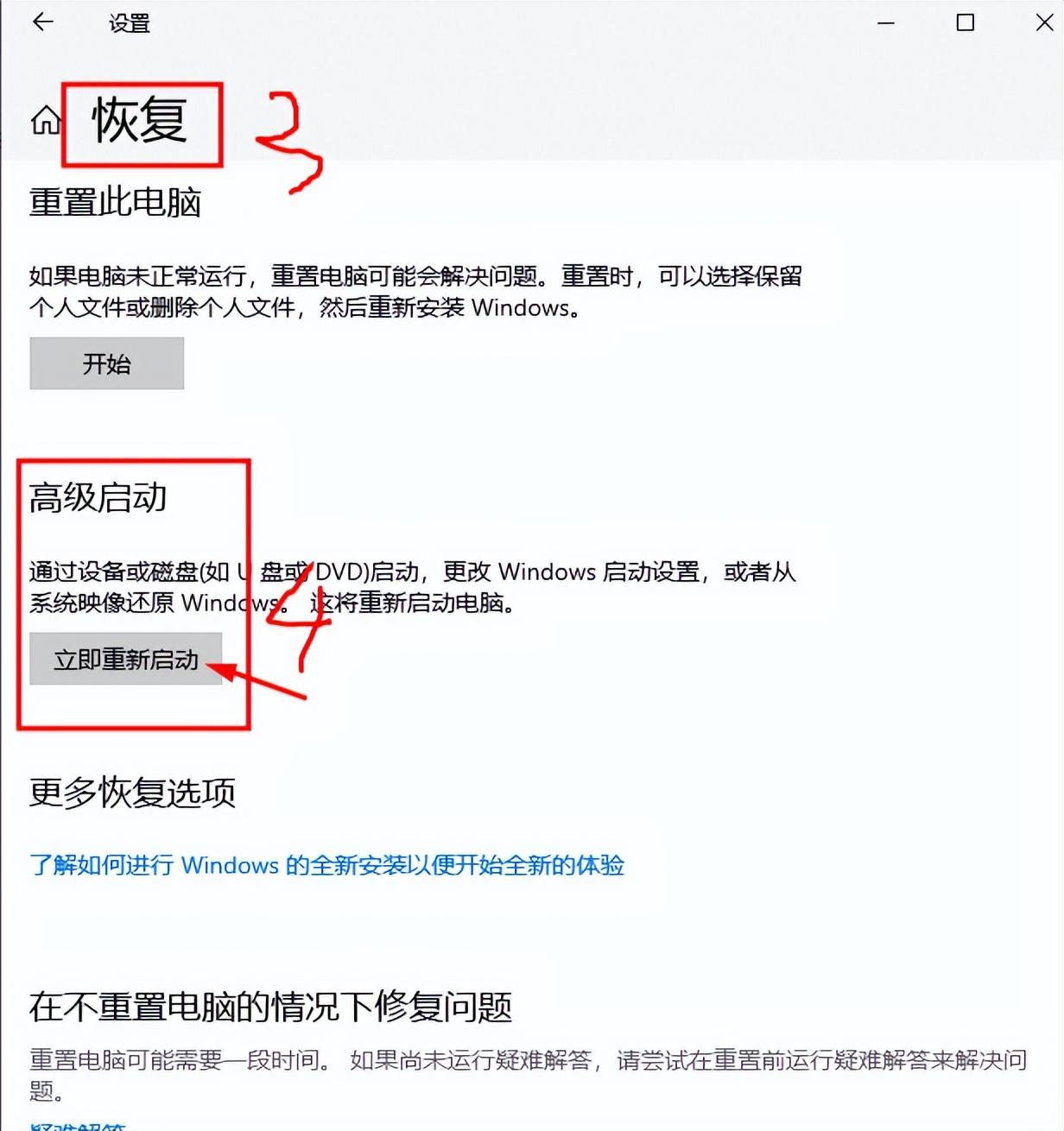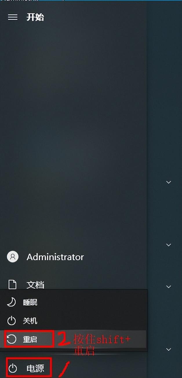 开始→电源按钮,按住Shift同时点击“重启”,然后Win10会自动进入高级启动菜单,再点击疑难解答→高级选项→启动设置→重启