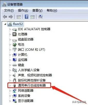 3、在上图中用点击设备管理器标签,进入下面图一所示的设备管理器界面,默认是显示各大类配置情况,找到通用串行总线控制器按钮,在其上面点击,展开具体项目。