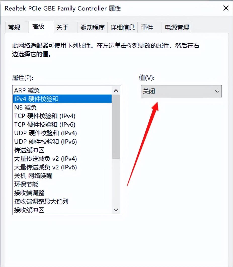 5、在高级选项页面的 属性 列表中选中“IPV4硬件校验和”(英文名:IPv4 Checksum Offload)。