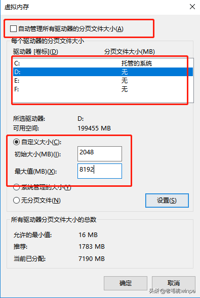 首先取消“自动管理所有驱动的分页文件大小”的勾选,接着选择除C盘以外的其他分区,点击“自定义大小”,将初始大小设置为2048,最大值设置为8192