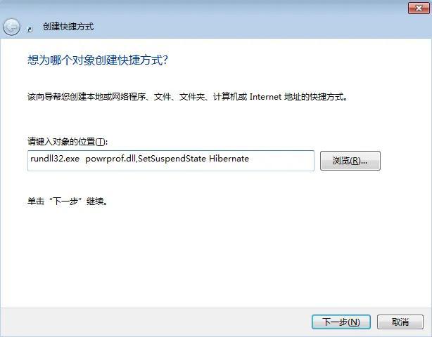 2、在【创建快捷方式】页面的位置栏中,输入【rundll32.exe powrprof.dll,SetSuspendState Hibernate】这个是创建休眠功能的命令,点击【下一步】;