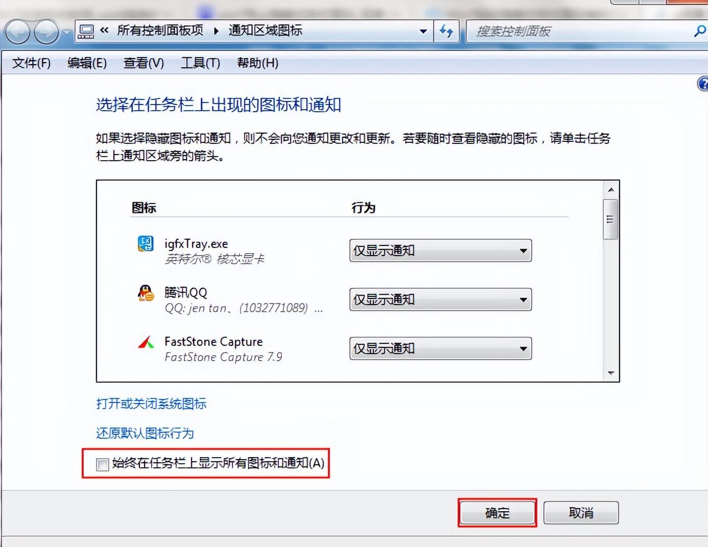 3、勾选取消“始终在任务栏上显示所有图标和通知”选项,点击确定按钮,如下图所示: