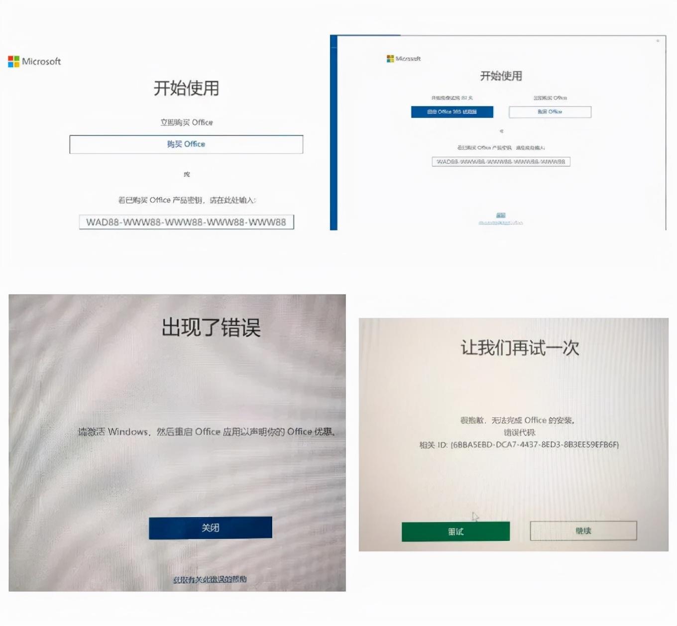 一般情况下,通过以上的步骤,我们就可以完成Office的激活操作!但是呢,有很多朋友在激活过程,会遇到一些问题,导致激活出错。比如说激活时显示出现错误或者要求再试一次,又比如提示需要购买Office才能激活或者显示账户下没有产品。