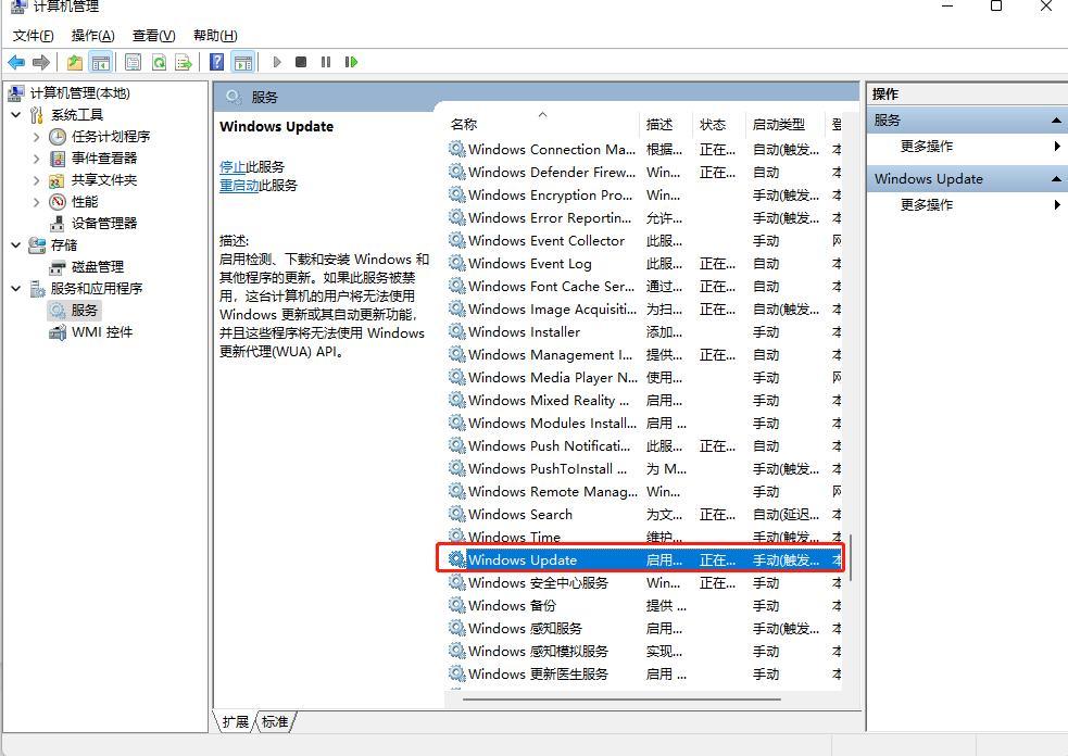 2、点开服务和应用程序,单机服务下拉列表中找到Windows update
