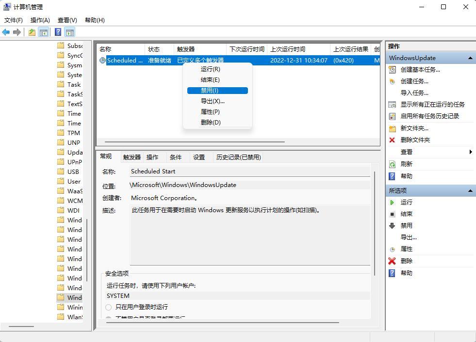 8、点开Windows,下拉找到Windows update,在右侧的面板中,右键单击选择禁用,这样就关闭了win11系统的自动更新了。