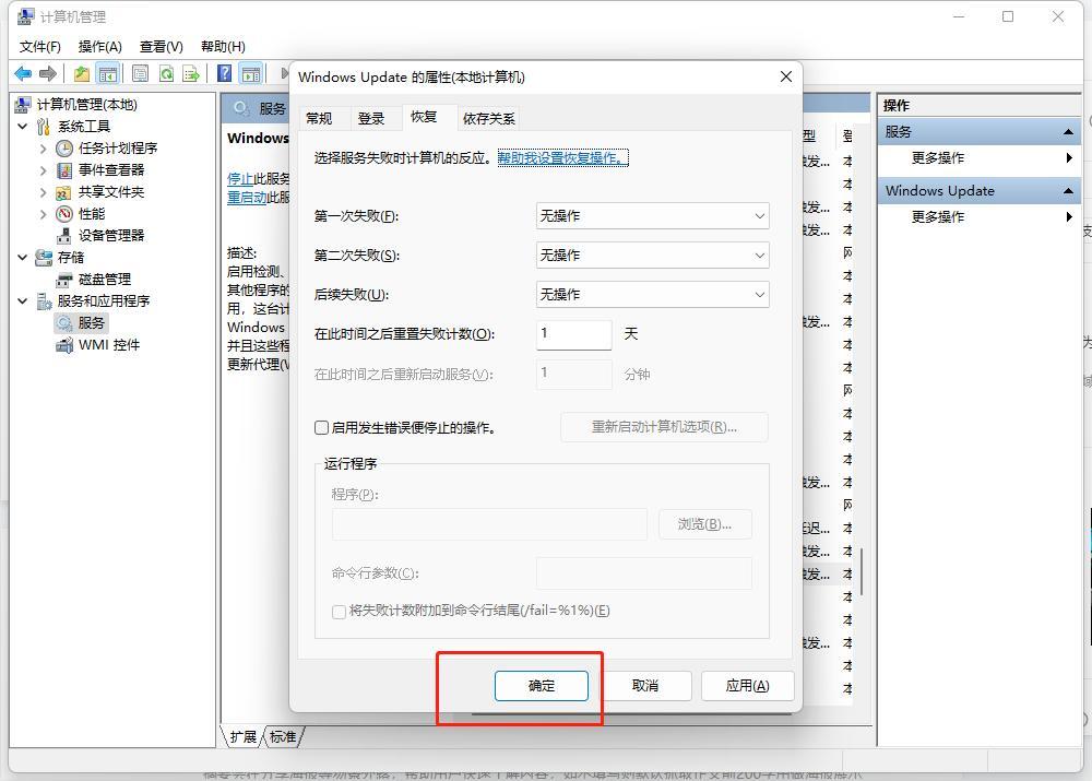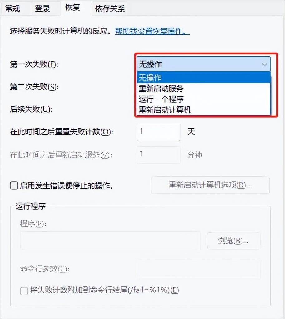 5、然后点击恢复—将第一次失败改为:无操作—–单击确定按钮