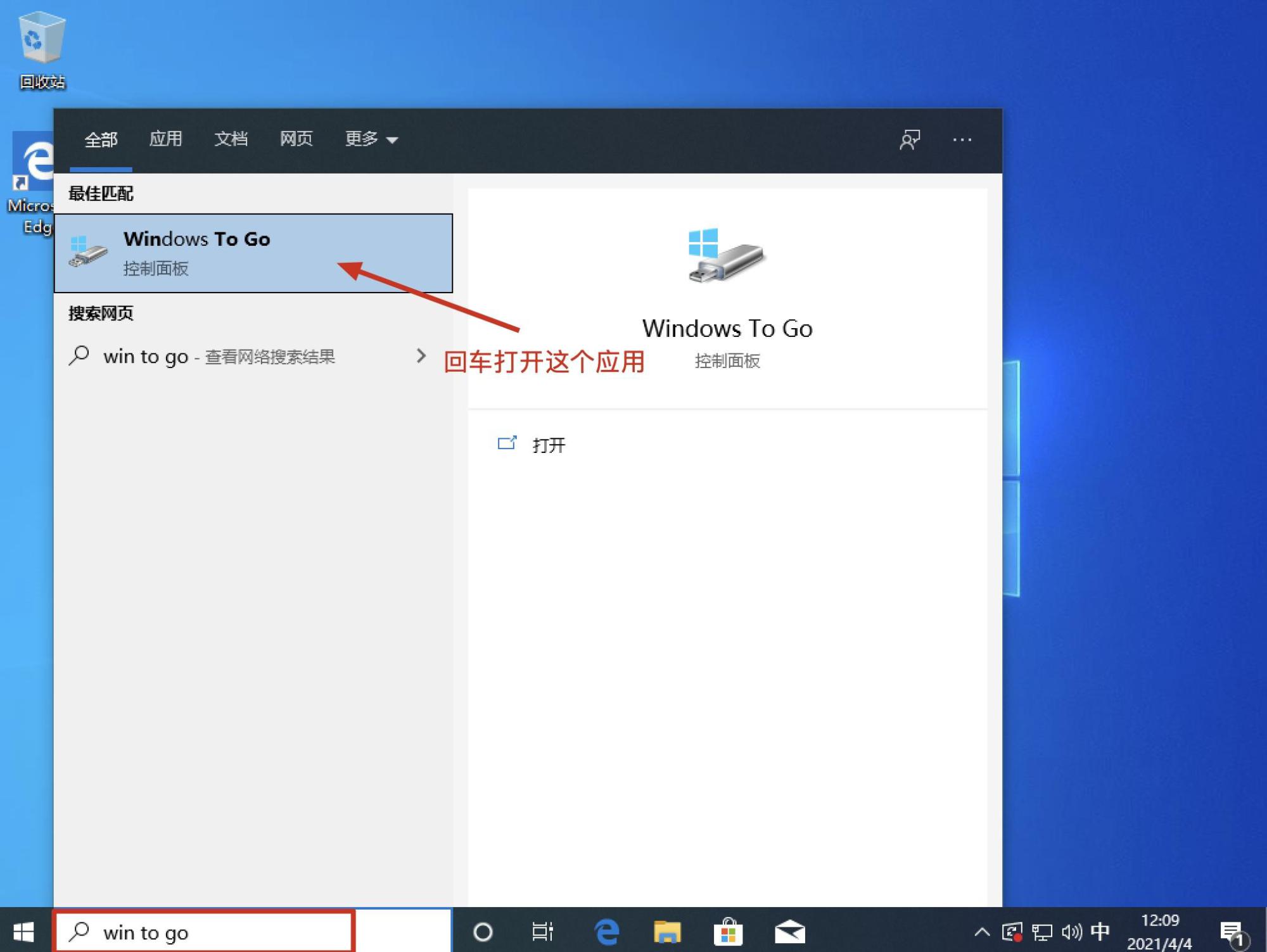 1.在搜索框输入“win to go”,如下图: