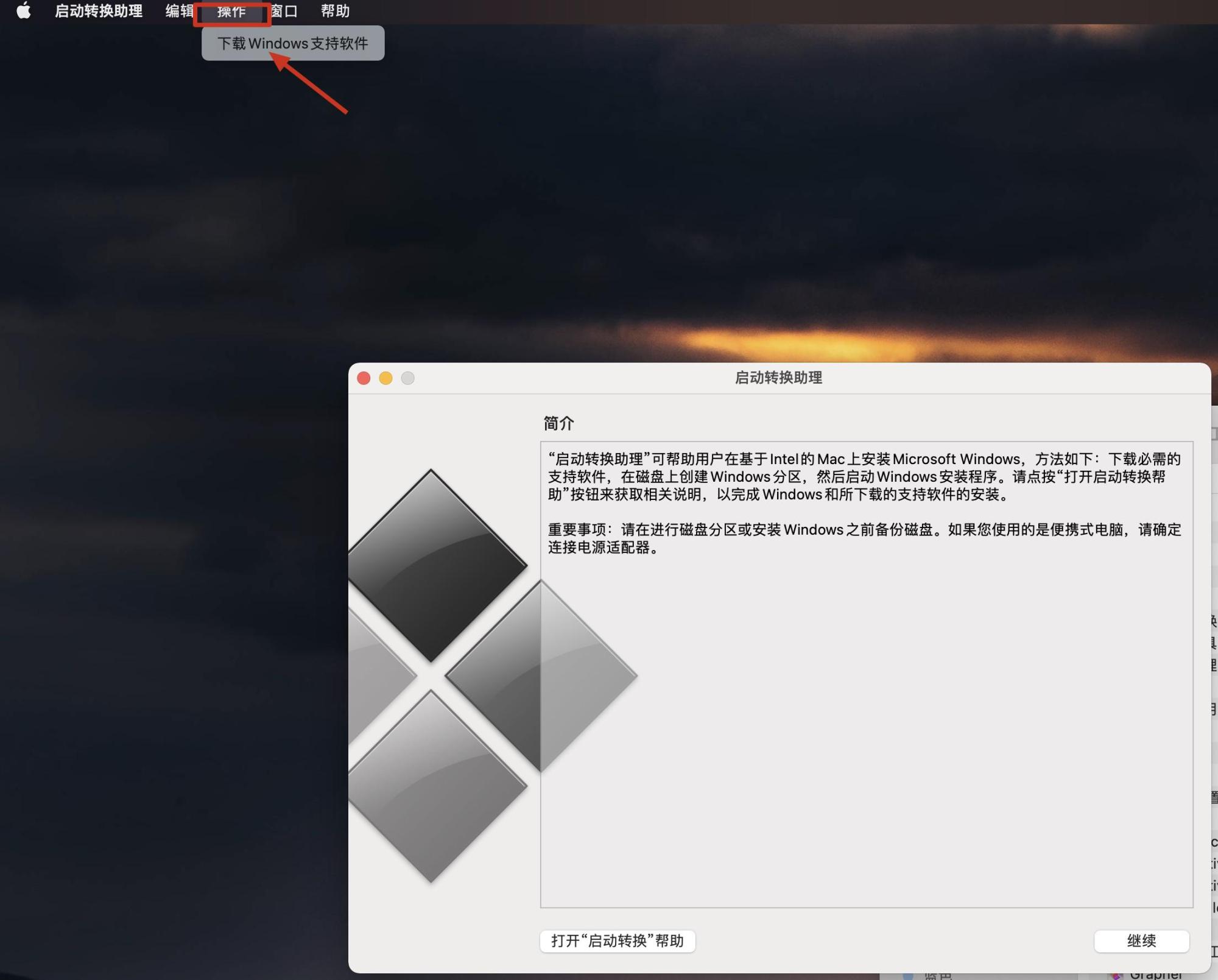 2.打开应用后,在mac系统的上边选择“操作,下载windows支持软件”