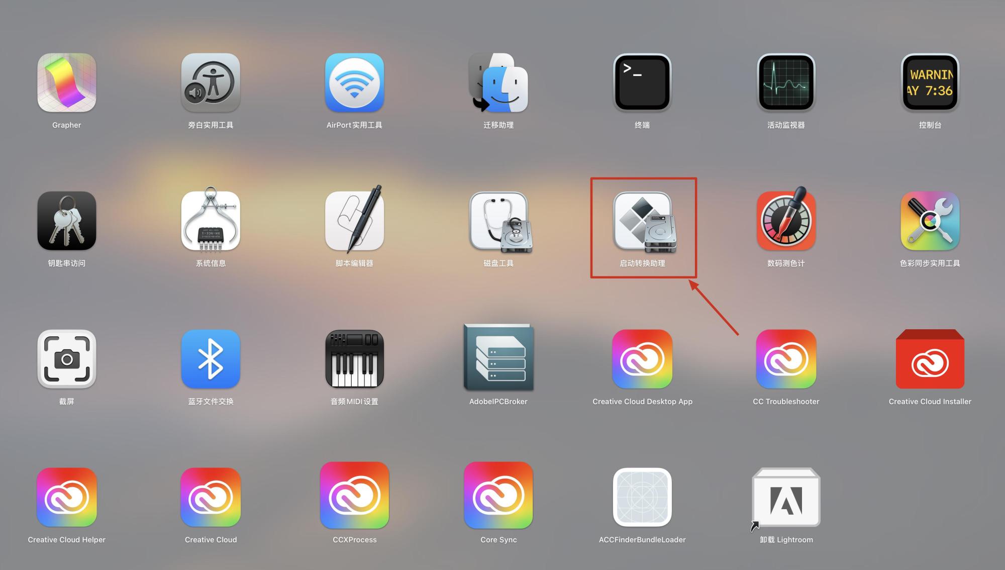 1.打开我们mac系统里的“启动转换助理”,如下图: