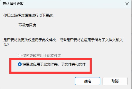 3、弹出“确认属性更改”选择第二项“将更改应用于此文件夹、子文件夹和文件”,等待完成即可。