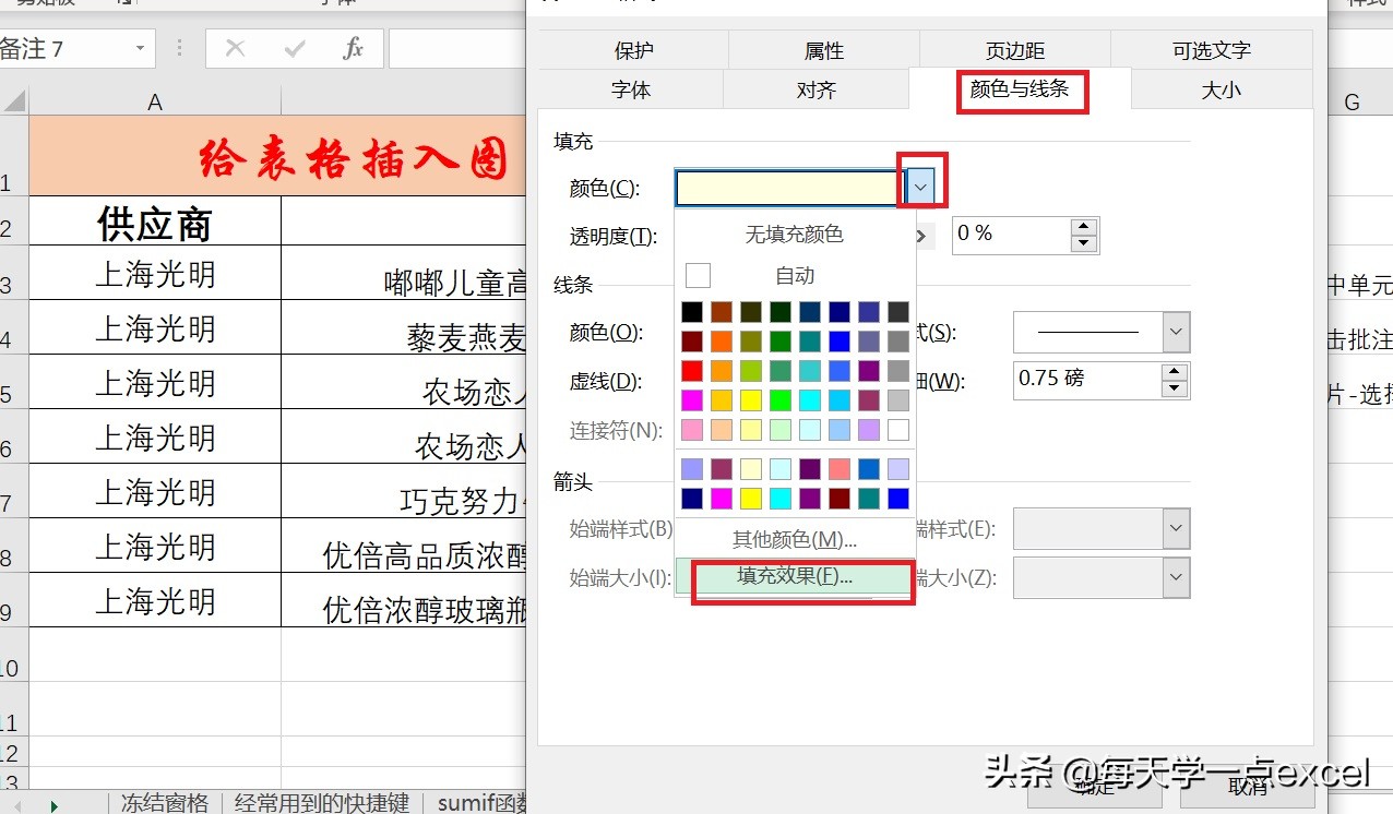 5、填充效果:弹出的框中选择颜色与线条下方的颜色下拉框选其中的填充效果选项(颜色与线条——颜色下拉框——填充效果)。