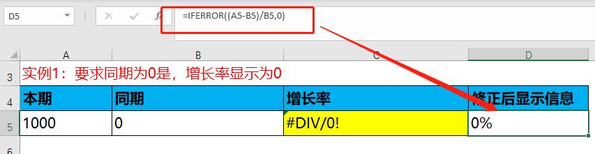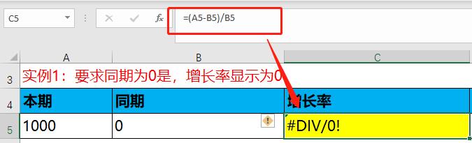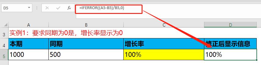 当我们把同期值改为500时,因为(A5-B5)/B5能计算出结果=(1000-500)/500=100%,所以就显示公式计算结果(即100%),而不是显示为0。