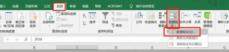 1.选择C2单元格后,【数据】—【数据验证】—在允许里面选择【序列】,在来源内输入【2016,2017,2018,2019】点击【确定】