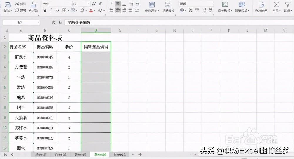 2、单击选中“单价”右边的单元格并输入“简略商品编码”,然后按住鼠标左键往下拉到表格底部。选中该列,如图所示: