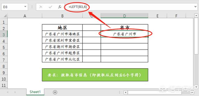 选中D3单元格 — 在编辑栏中输入公式“=LEFT(B3,6)”– 按回车键。
