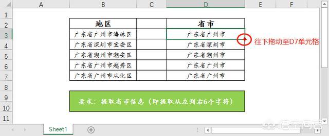 3、选中D3单元格 — 鼠标移到单元格右下角往下拖动至D7单元格即可快速批量提取。