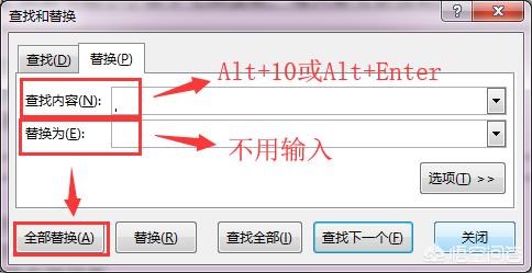 1、按快捷键“Ctrl + H”打开“查找与替换”对话框的“替换”选项卡 — 在“查找内容”输入“Alt + Enter”或“Alt + 10”(虽然看起来没内容,但是已经在查找内容框输入了换行符)–“替换为”为空 — 点击“全部替换”按钮。
