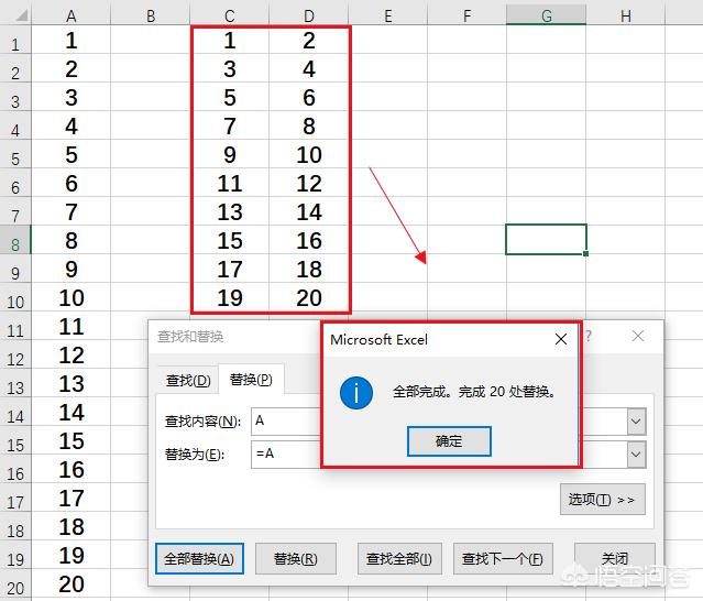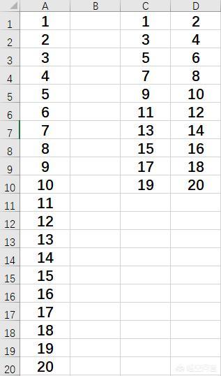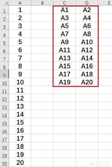 比如我下面的表中A1:A20是序号1-20,我想把它变成10行2列的数据(图中的C1:D10单元格区域)。